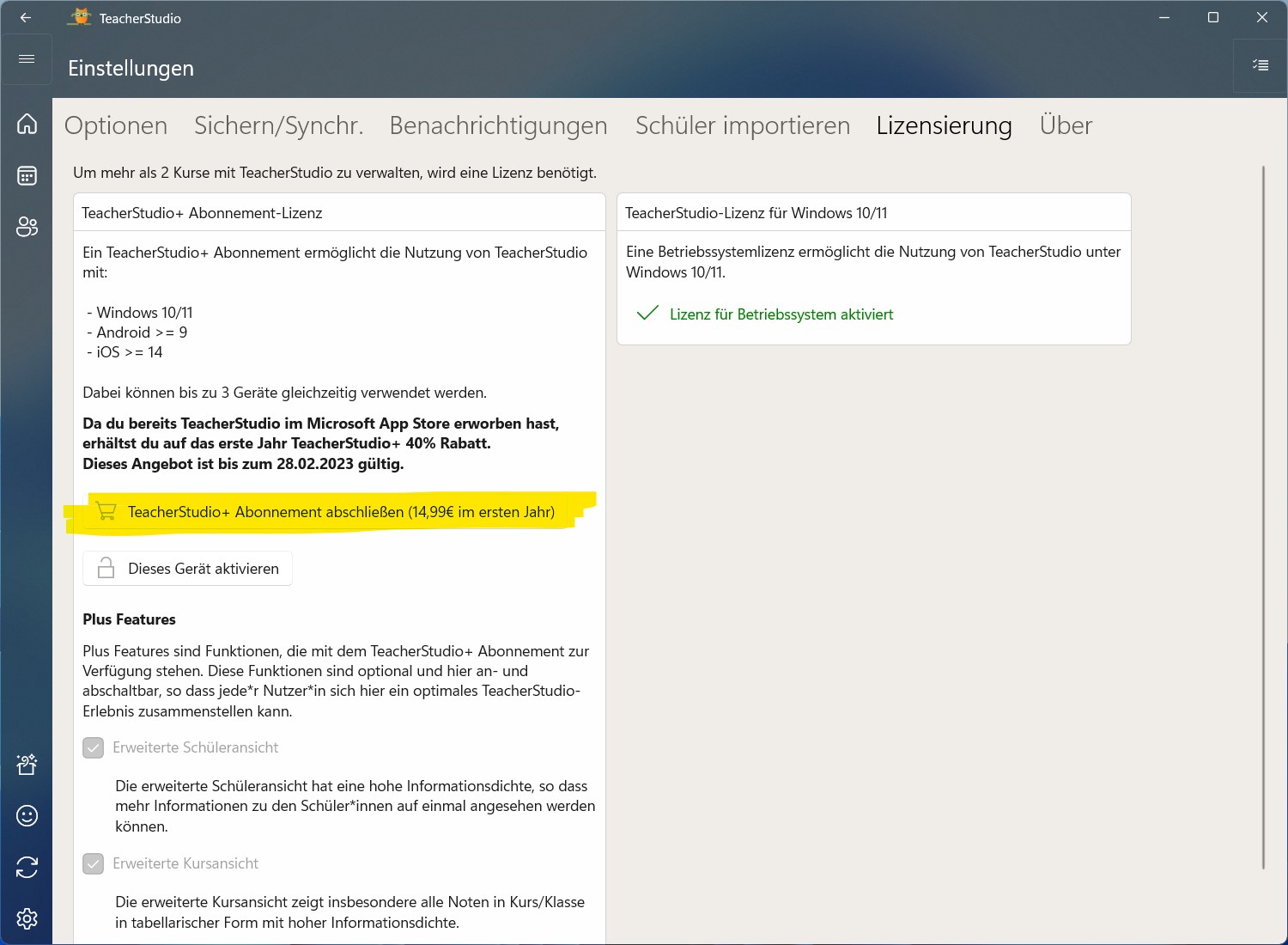 Wenn du bereits die TeacherStudio Windows App erworben hat, erhältst du bis zum 28.02.2023 einen Preisnachlass von 40% auf das erste Jahr TeacherStudio+. Klicke dazu einfach in TeacherStudio für Windows auf die entsprechende Schaltfläche.