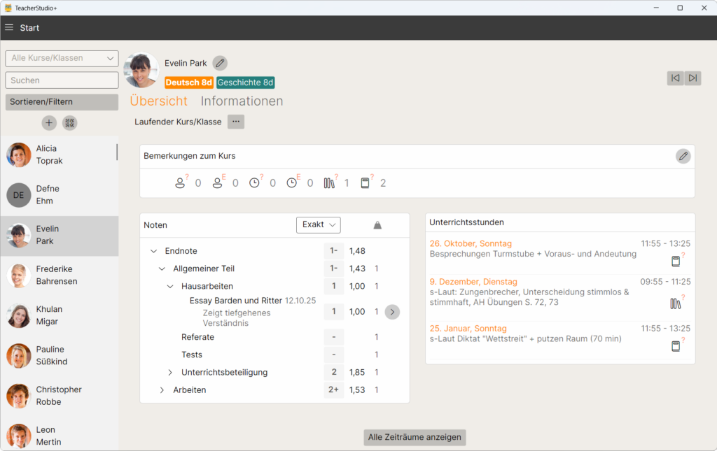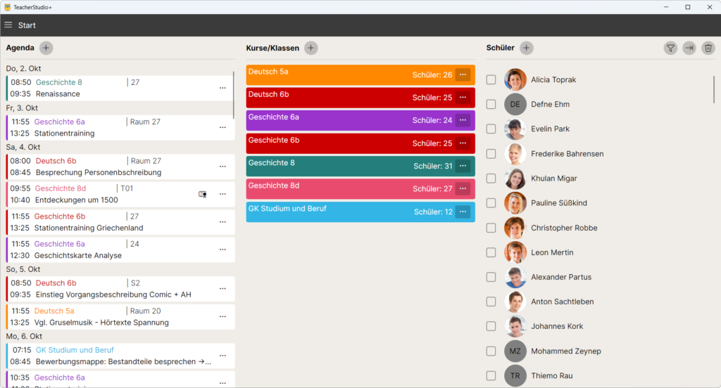 Die neue Benutzeroberfläche ist nun nicht nur technisch und ästhetisch moderner, sondern auch nahezu deckungsgleich auf allen unterstützten Betriebssystemen. Ob ihr nun also Windows, Android, iOS, IPadOS oder macOS nutzt: TeacherStudio bedient sich immer gleich, was einen Wechsel zwischen den Betriebssystemen erheblich erleichtert. Gleichzeitig behalten wir unseren datenschutzfreundlichen Offline-First-Ansatz. Online-Funktionen sind auch weiterhin ein Option, aber dabei keine Voraussetzung für den Einsatz von TeacherStudio.